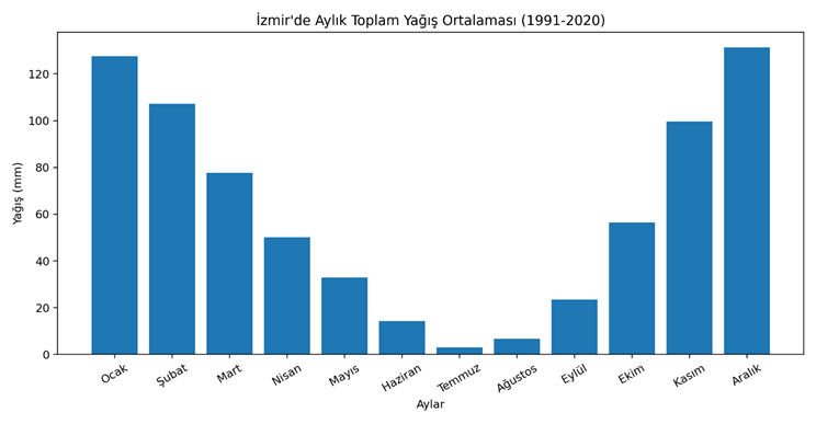 Grafik 1. İzmir’de aylık toplam yağış ortalaması (1991-2020).