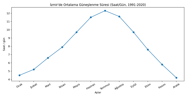 Aşağıda yer alan iki grafik İzmir için aylık yağış ortalaması ve ortalama güneşlenme süresini gösterir. Bu temel veriler dahi bakım ve temizlik planının kıştan yaza aynı mantıkla yürütülemeyeceğini ortaya koyar.